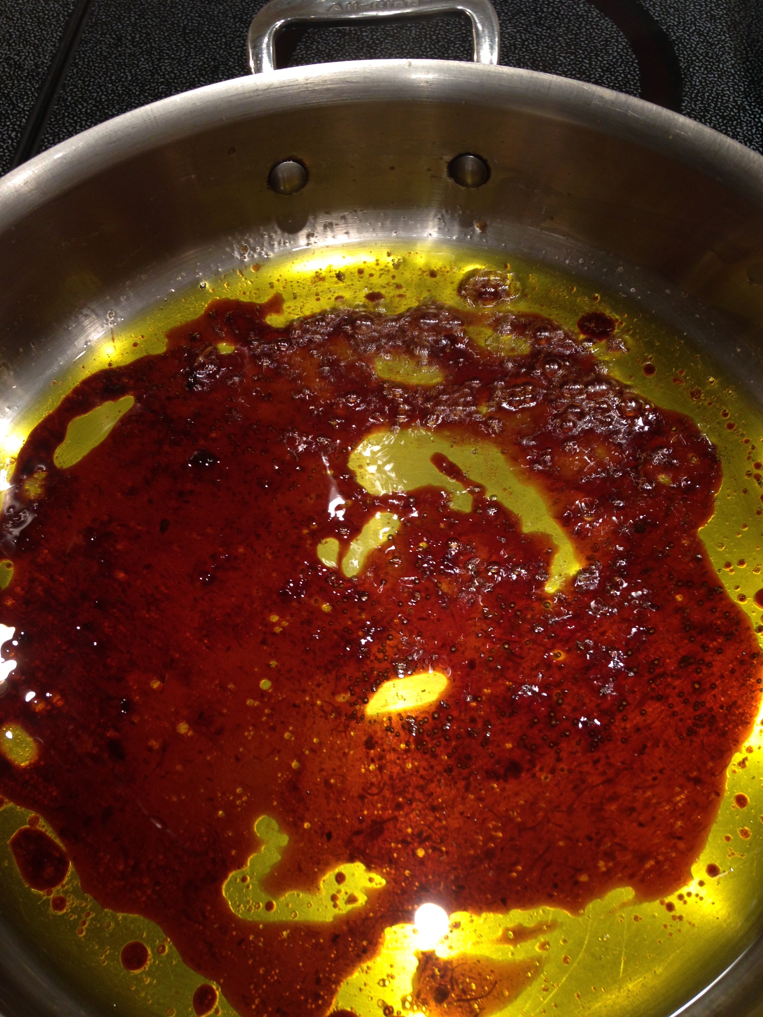 Once the meatballs have been formed, place a very large sauce pan over medium heat. Add the remaining olive oil and heat the oil until very hot–you will see the oil appear to get thinner and it will roll around the pan with ease. There should be about 1/8 inch of oil on the bottom of the pan. Depending upon the size of your pan you may need to add more or less oil. Don’t be stingy here. Most of the oil will end up thrown out, so it won’t be as unhealthy as it sounds. If there is too little oil, however, the meat will stick to the bottom of the pan and make it very hard to keep the meatballs well-formed.